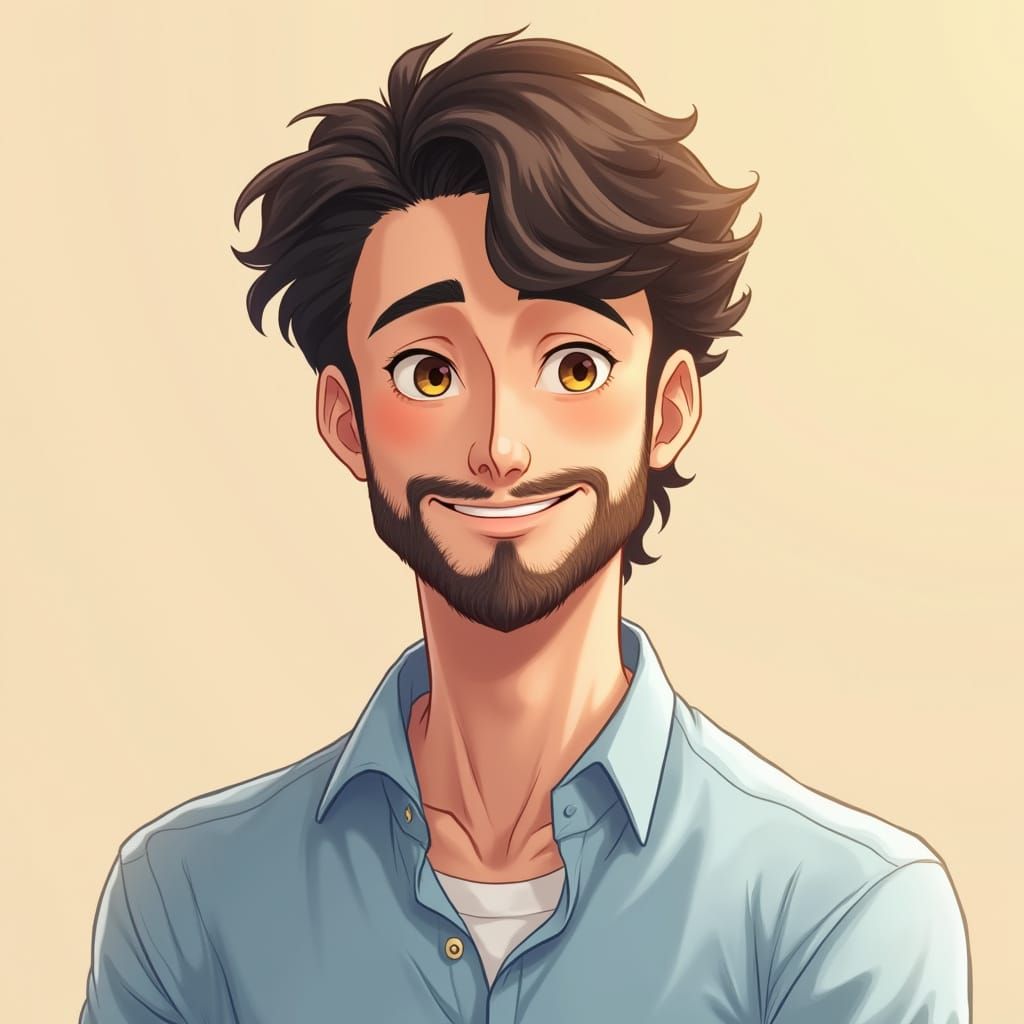 This anime-style portrait of a smiling man exudes friendly professionalism, with intricate details and rich colors reminiscent of fantasy concept art, against a soft, warm background.
