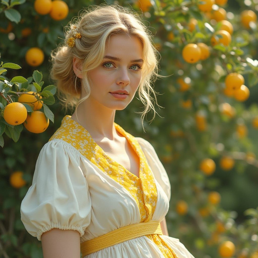 A sun-drenched image of a blonde European woman in a white lemon-patterned dress, seated in a garden lane with a basket of lemons. The image evokes the soft light and pastel palette of Impressionism.