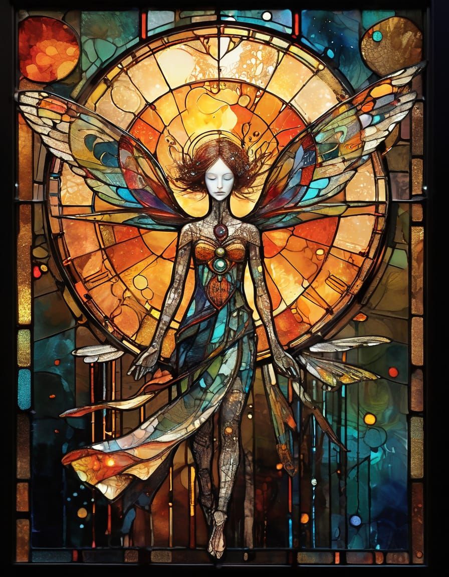 This image showcases detailed stained glass in an art brut style. It features a vibrant, energetic composition with dramatic lighting, rendered with liquid ink and watercolor effects.