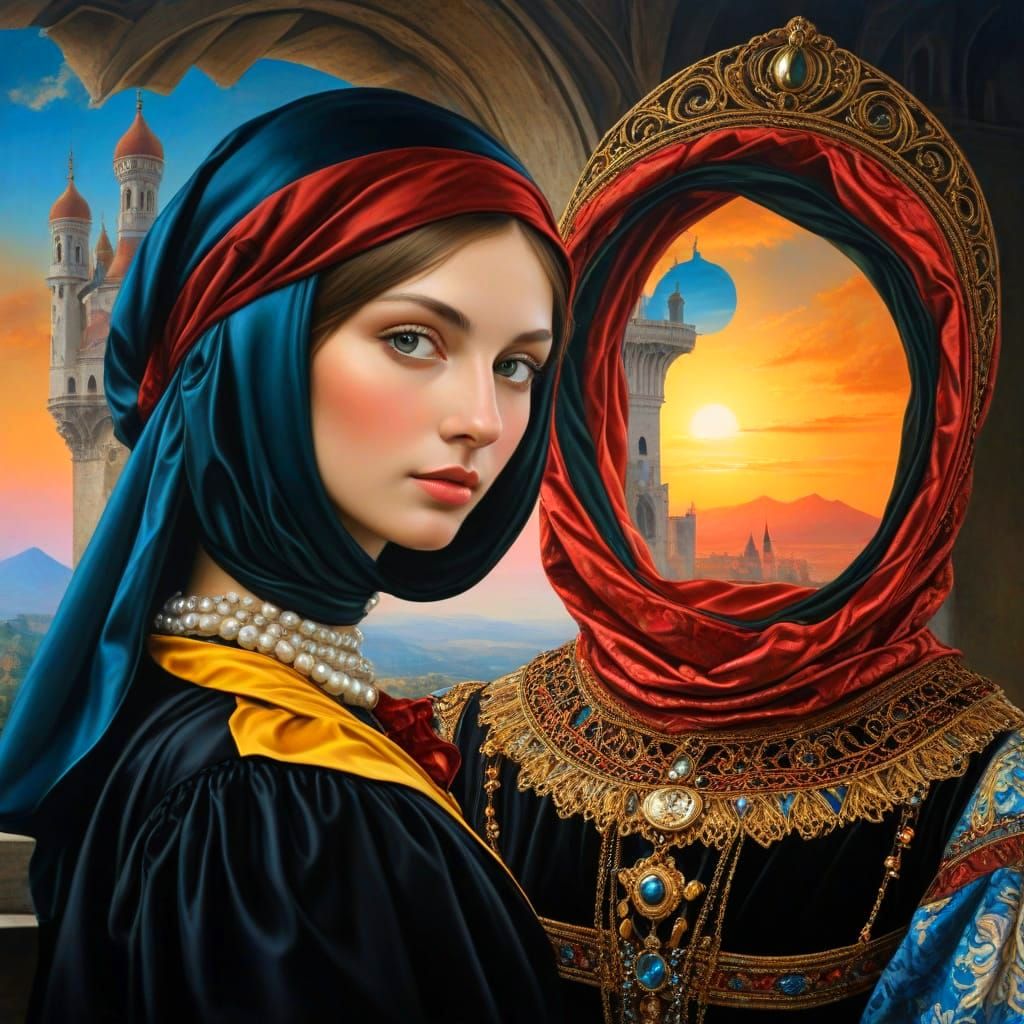 charming happy 45-year-old Italian Renaissance ladies dressed with outlandish extravagance by Raphael, Giovanni Bellini, Andrea Mantegna, Olga Kvasha, William Russell Flint, George Spencer Watson, Alessio Albi; fantastic surrealistic background