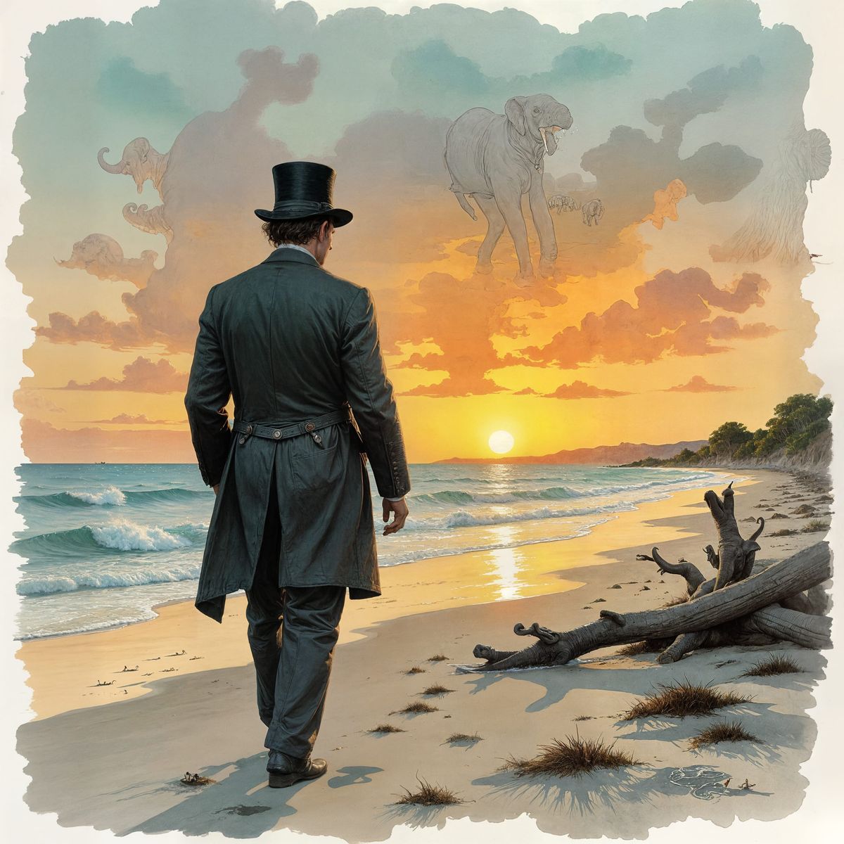 This image depicts a surreal scene of an elephant-headed man on a beach, rendered in a detailed pencil sketch with watercolor accents, evoking a nostalgic fantasy style.