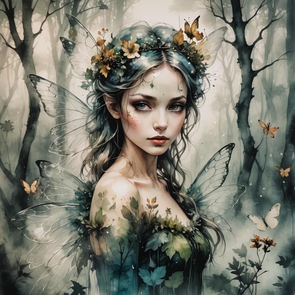 This image shows a beautiful magical fairy in double exposure. Inside the fairy's silhouette is a modern European ink painting of a magic woodland, creating a surreal effect.
