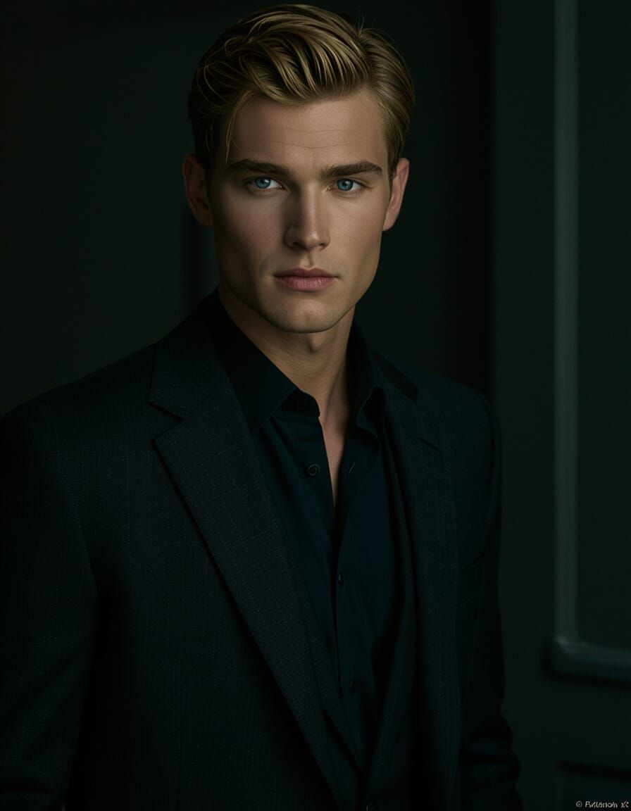 This image features a young man with short blond hair, blue eyes, and a strong jaw. He has a charming look and is dressed in a dark suit.