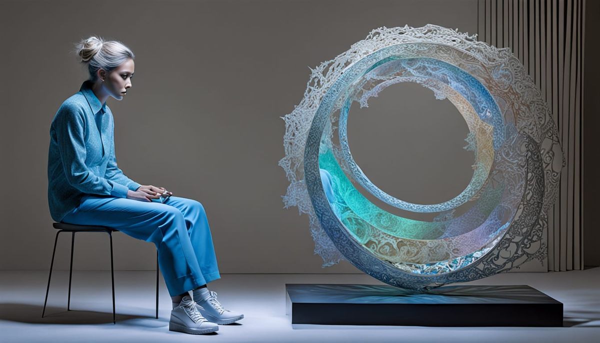 A surreal, dreamlike collage featuring a female sculptor seated within her intricate spiral artwork. The bio art style incorporates bioluminescent elements and fragmented mirrors, illuminated by vivid neon lighting.