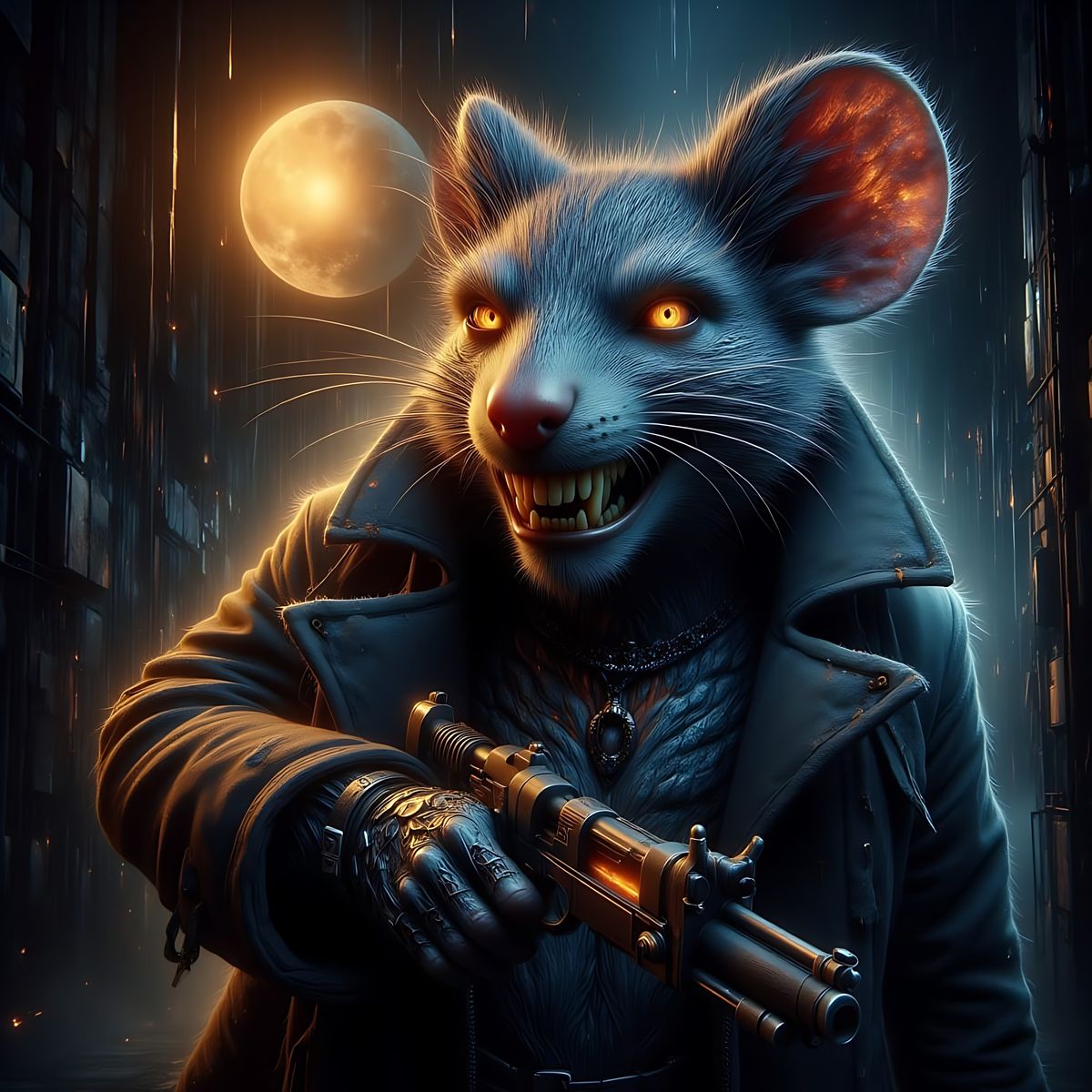 This image shows a menacing gangster mouse enforcer in a pen and ink noir style, holding a massive tommy gun made of Swiss cheese. Cinematic lighting and vivid colors create a gritty atmosphere.