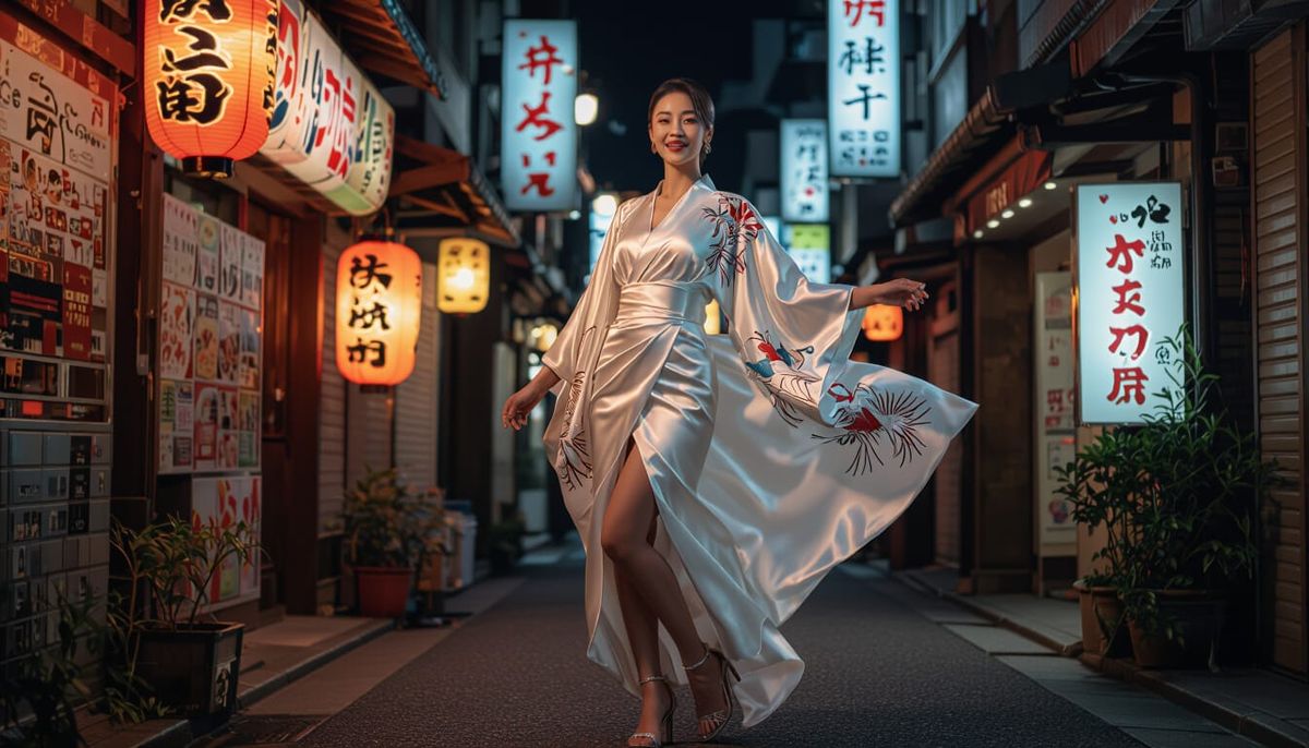 This image shows a hyperrealistic full-body shot of a young woman in Tokyo at night. She wears a satin wrap-dress and kimono-style jacket, captured mid-turn in a lantern-lit alley.