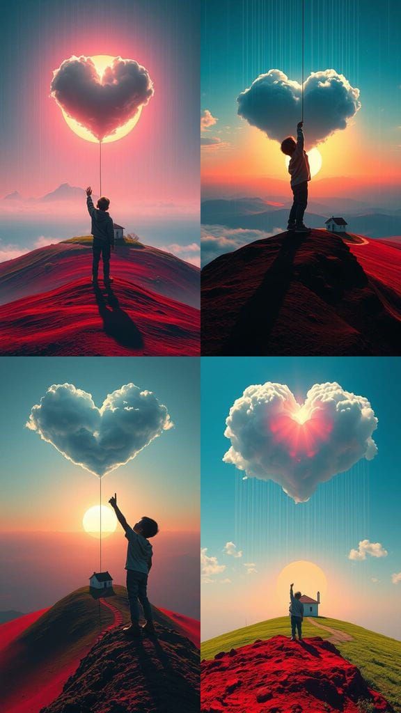 This image shows a child reaching for a heart-shaped cloud in a surreal landscape. The scene features a blend of natural and dreamlike elements in a surrealist style, with a striking color palette.