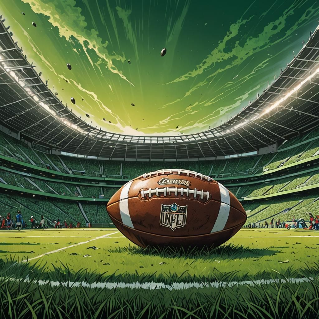 This image showcases a football on lush green grass within an empty stadium, rendered in a comic book art style. The artwork is smooth and highly detailed.