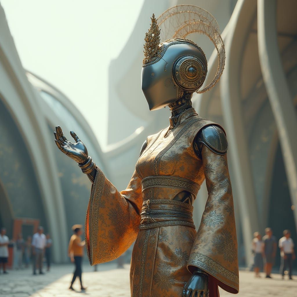 A hyperrealistic image depicts a robot in traditional Thai attire in front of a futuristic train station. The robot wears an intricate silk suit and ceremonial headdress, with cinematic lighting.