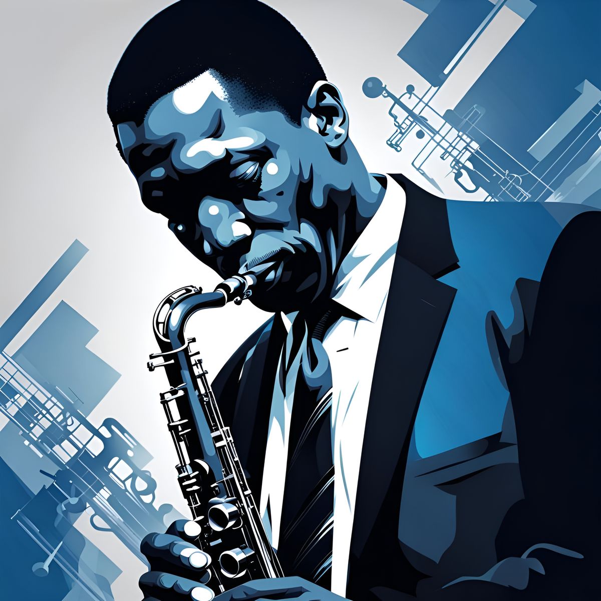 A duotone vector graphic abstractly depicting jazz legend John Coltrane. The artwork emphasizes a black and blue color scheme in a fusion style.