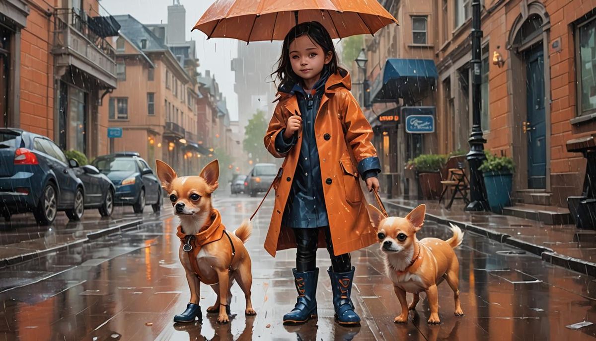 This image shows a cute, cartoon-style little girl in an orange coat and blue boots with her chihuahua in the rain. This adorable full-body portrait has a hyperdetailed, maximalist aesthetic.
