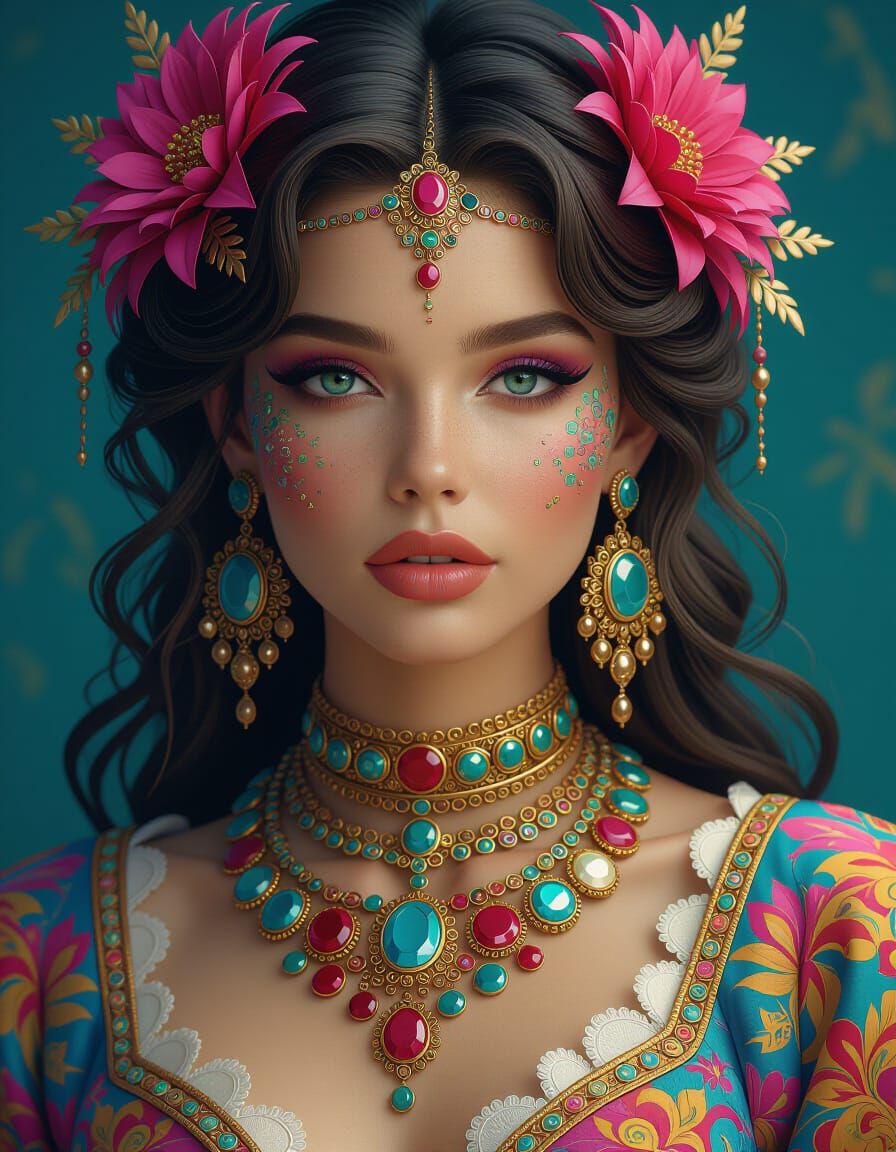 This image showcases a hyperrealistic portrait of a woman in vibrant, detailed attire and advanced jewelry. The artwork features a dynamic color palette and cinematic lighting, rendered with incredible detail.
