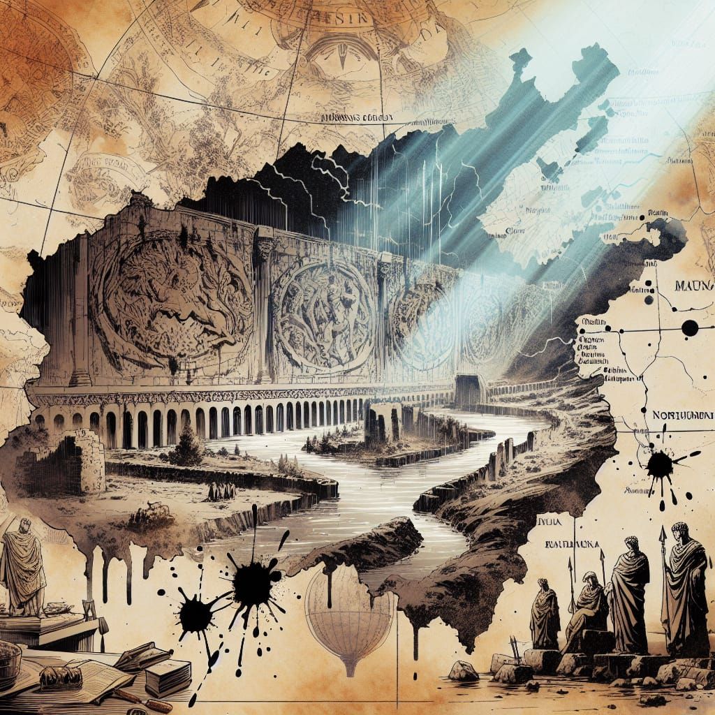 This image shows Hadrian's Wall in Northumberland, set against a map backdrop. The scene, reminiscent of manhwa art, uses ambient lighting and ink effects to evoke a sense of historical depth and detailed focus.