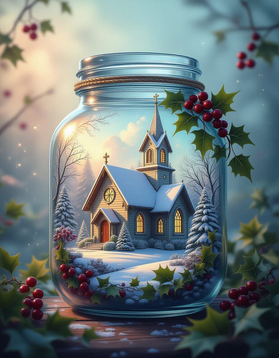 This image showcases a hyperrealistic, concept art depiction of a detailed Christmas church inside a carved jar, surrounded by ivy and berries, with a misty background and ethereal fantasy elements.