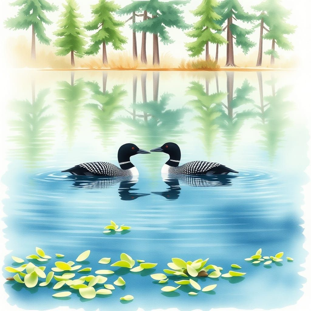 Watercolor painting of a tranquil pond with two common loons swimming gracefully together. In the foreground, clusters of soft green duckweed on the rippling water. Gentle brushstroke textures and watery gradients create a dreamy flow. Tall pine trees rise in the background, reflected subtly in the pond. ...