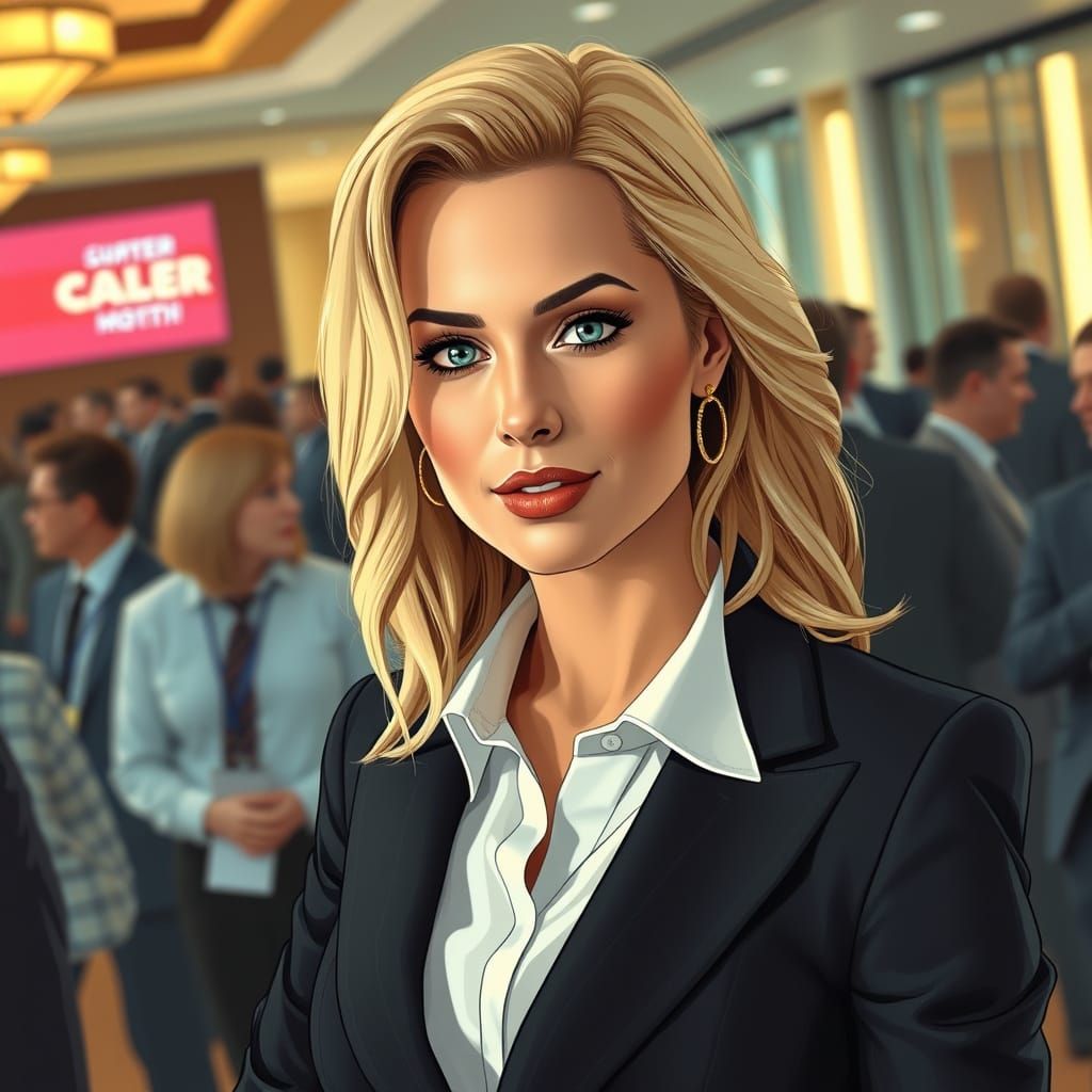 A poised, 37-year-old Regina George commands attention in a tailored business suit, exuding confidence, style, and a hint of vulnerability as she navigates the corporate world with her signature wit and charm.