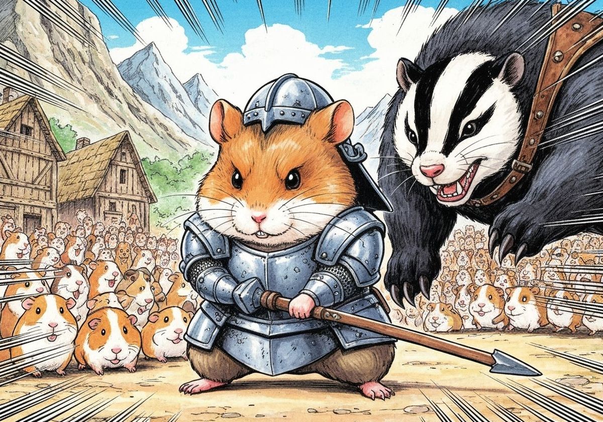This image shows a hamster in medieval plate armor defending a village from a badger. The scene is rendered in a vibrant cartoon style with dynamic action lines and exaggerated expressions.
