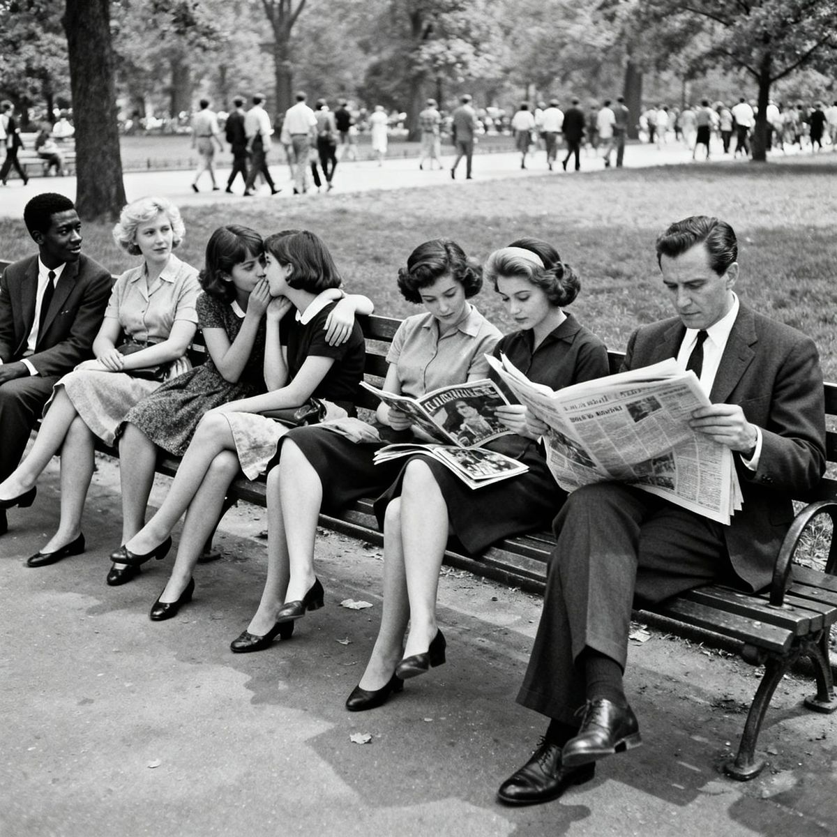 This black and white street photograph captures a 1960s park bench scene. It depicts people conversing, whispering secrets, sharing a magazine, and reading, with a bustling park in the background.