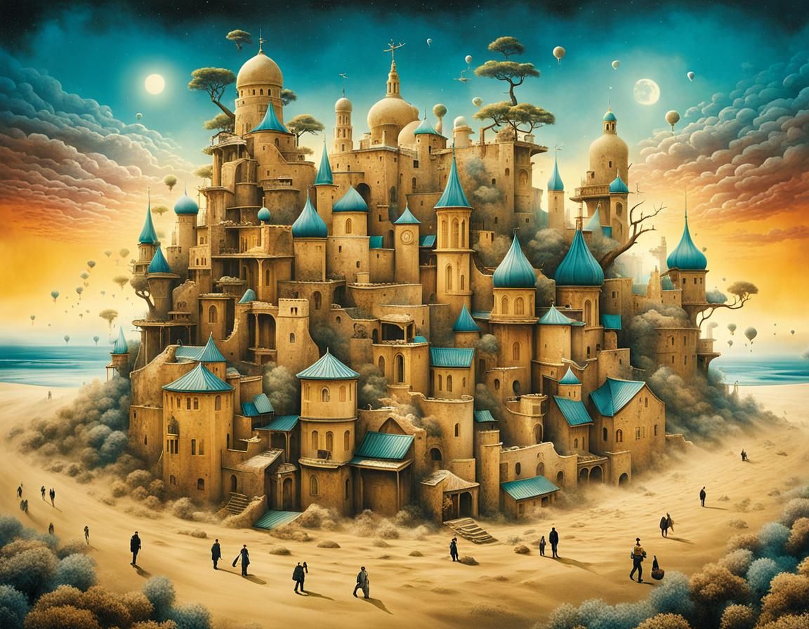 Surreal Sandcastle Dreamscape with Bonsai, Collage Art