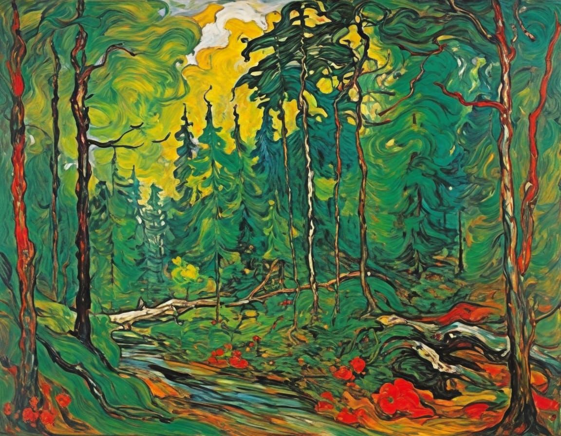 This image depicts a mystical Dryad surrounded by the vibrant colors and expressive brushstrokes of a vivid oil painting, set amidst a shadowy, enchanted forest grove.