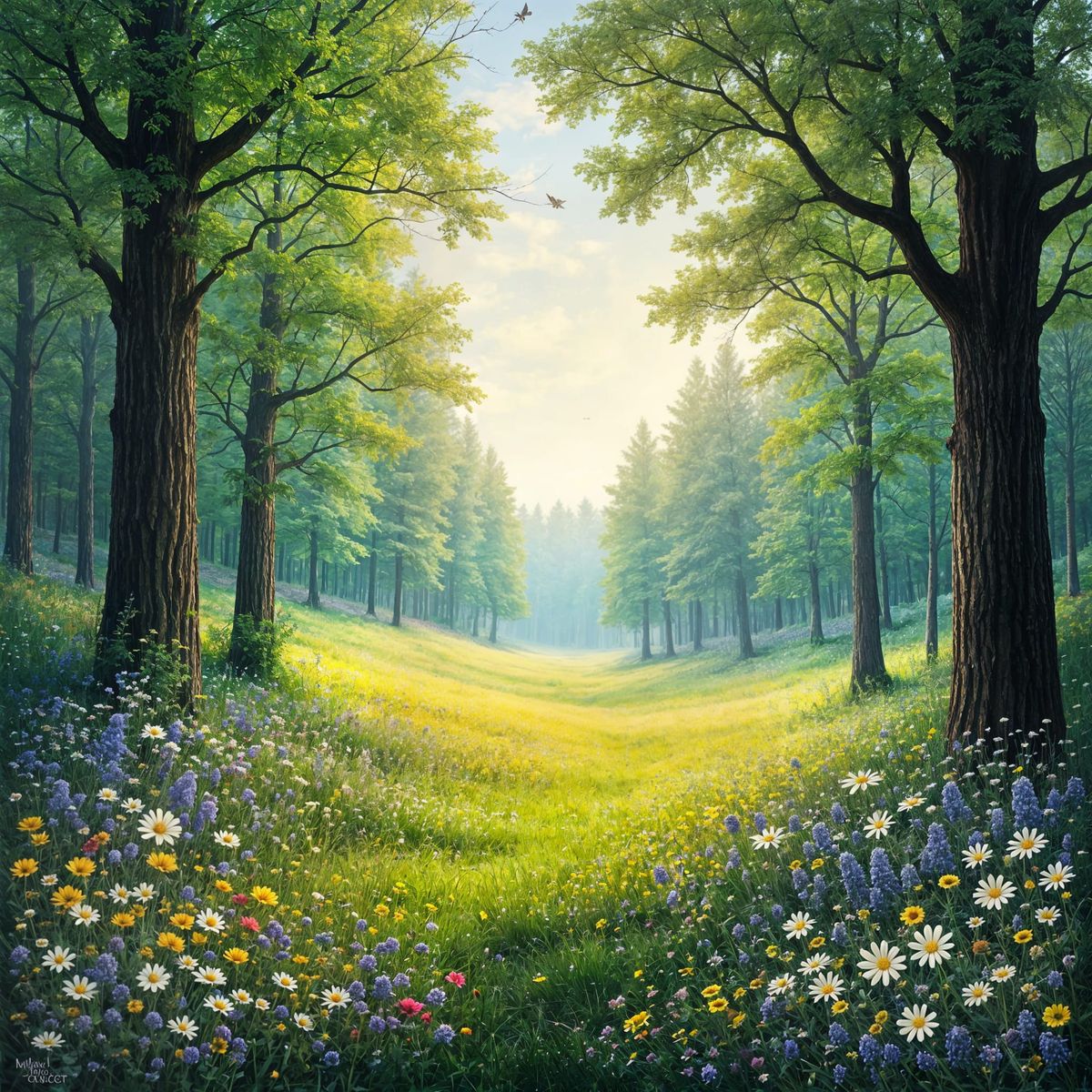 A serene image of a vast forest with a seemingly endless horizon, dotted with colorful flowers scattered across the forest floor, evoking a sense of tranquility and natural beauty.