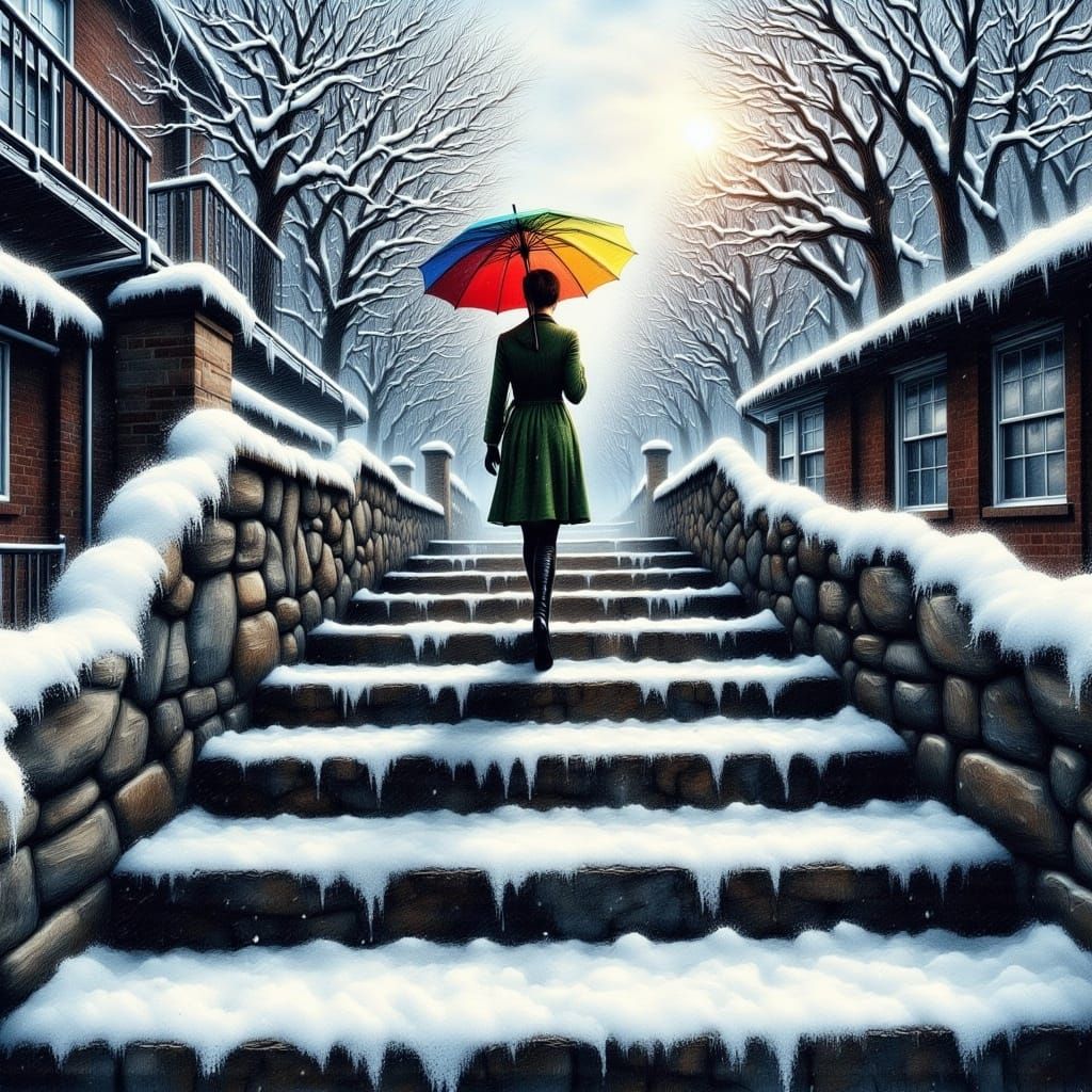 <lora:SuperHyperrealismFlx:1.0> <lora:Art Ink Drawing Flux:1.0> , urban, snowy city stairs, people walking up stairs, a person walking with a vibrant rainbow umbrella, pale blue sky peeking through, soft white snow on steps, cool greys and blues in the background, silhouette of person holding the ...