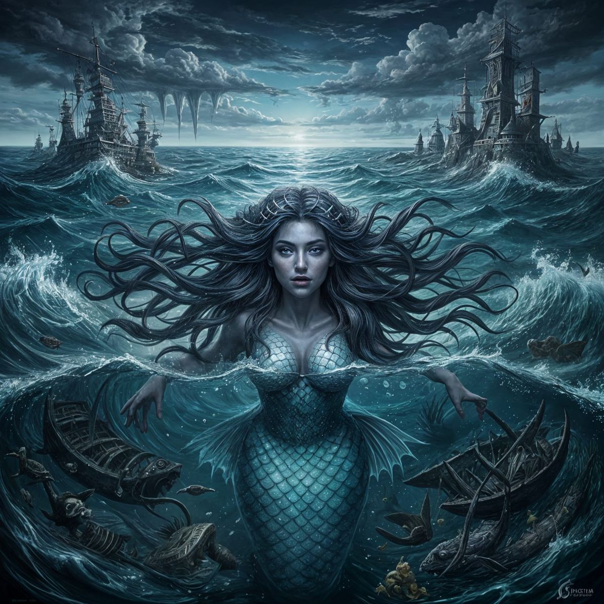 A beautiful mermaid with iridescent hair and shimmering scales emerges from a stormy sea, singing to lure pirate victims towards sunken shipwrecks below.