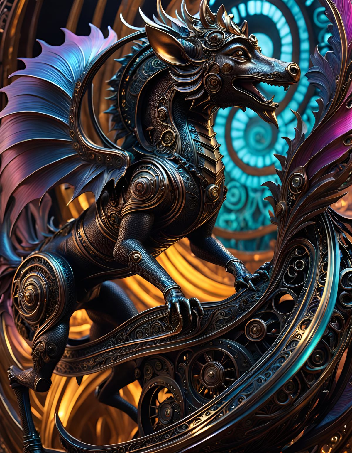 A detailed sculpture of mythical creatures in a fantasy setting. The metallic artwork features a goblincore steampunk aesthetic, with intricate designs and optical illusions in bright, deep colors.