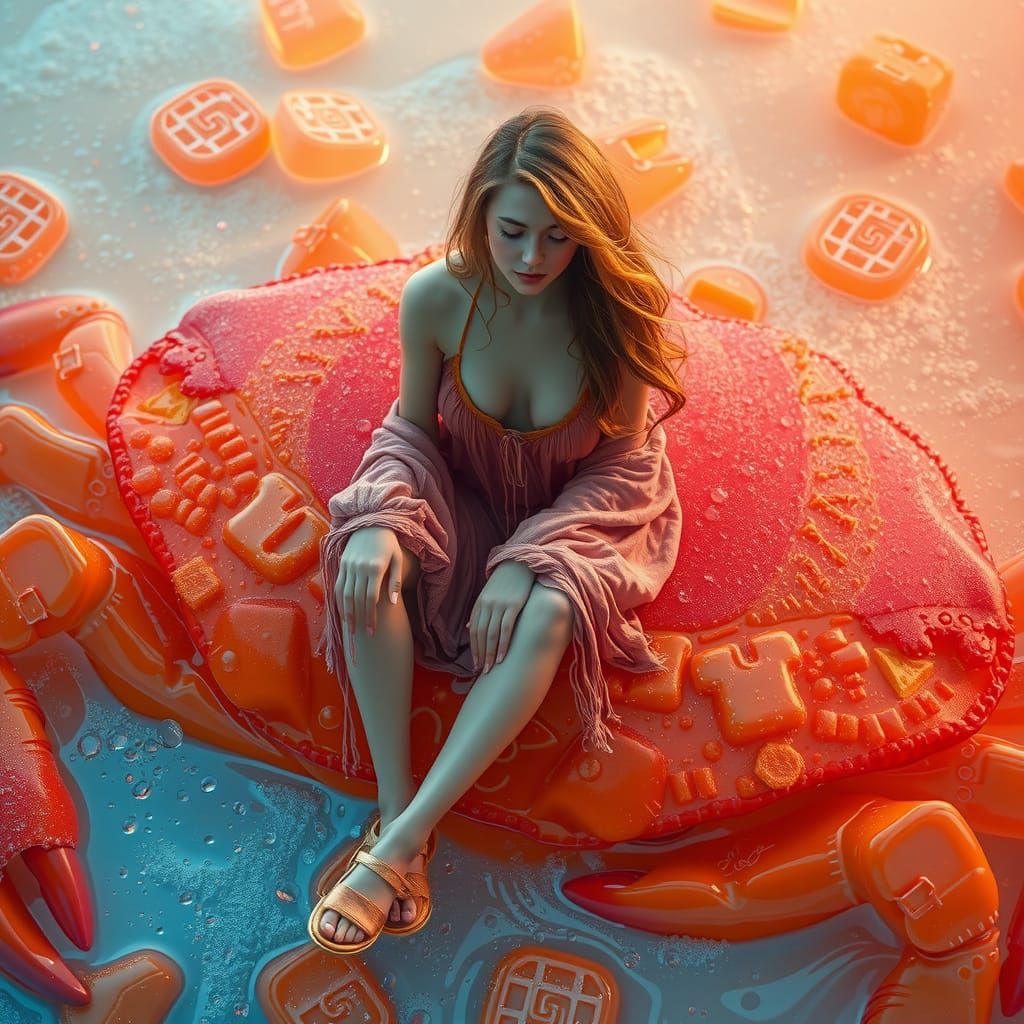 A whimsical image showing a golden-haired woman in ragged clothing sitting atop a giant gummy crab. The scene is set in a fizzy soda sea, rendered with warm amber and bronze tones in a dreamy, neon-lit style.