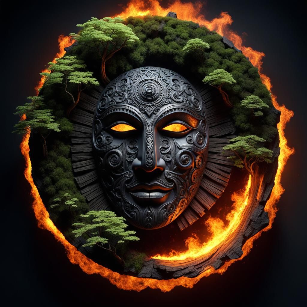 This image shows a meticulously arranged fantasy landscape within a ring of fire. The elements of nature are displayed in high detail, presented as digital art.