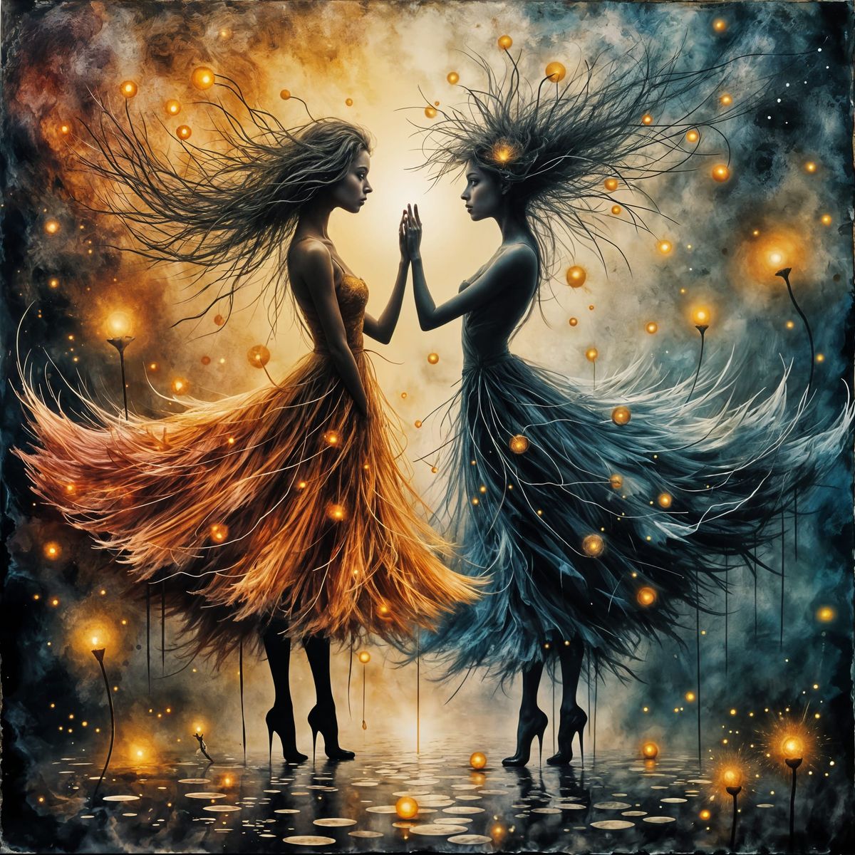 This abstract expressionist piece depicts two figures, one of light and one of darkness, in a dynamic, balletic duel. The background features a tempest of ethereal colors, creating a mixed media collage effect.
