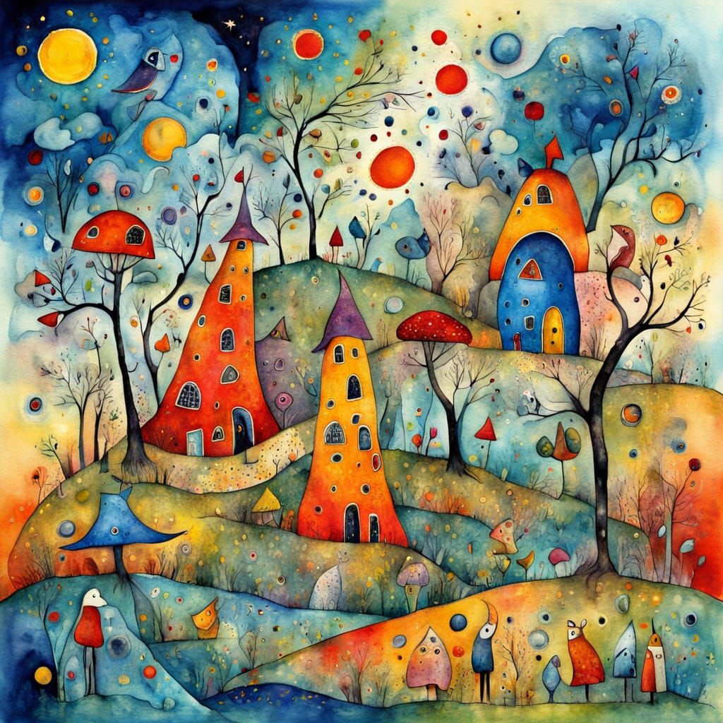 This image displays a vibrant, detailed watercolor and ink piece. The artwork evokes emotion with a whimsical, surreal aesthetic, rendered in a post-impressionist style with thick, colorful paint layers.