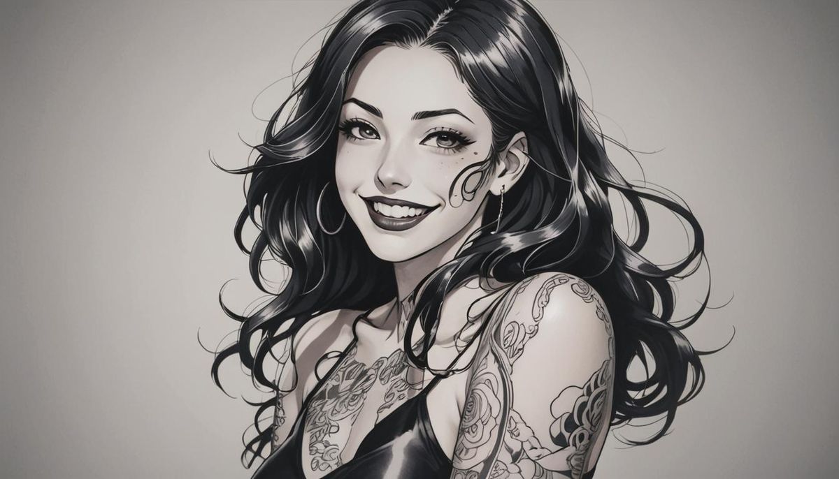 A striking picture of a tattoo artist with long, dark wavy hair. The image, reminiscent of Studio Trigger's anime style, features extreme shading and a manga scan aesthetic.