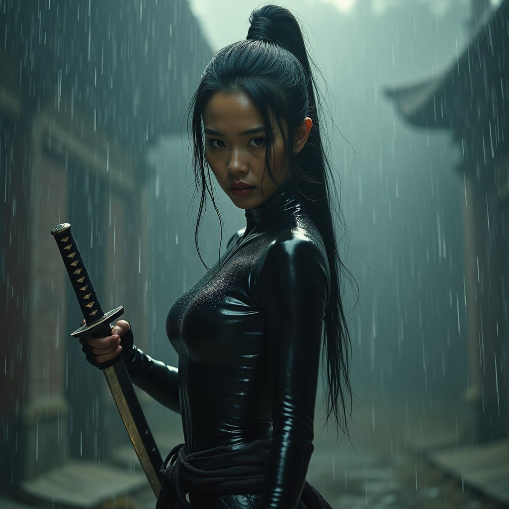 This image shows a fierce female warrior in a black latex suit, posed heroically in a storm. She holds a katana, highlighted by cinematic lighting in a dramatic and atmospheric style.