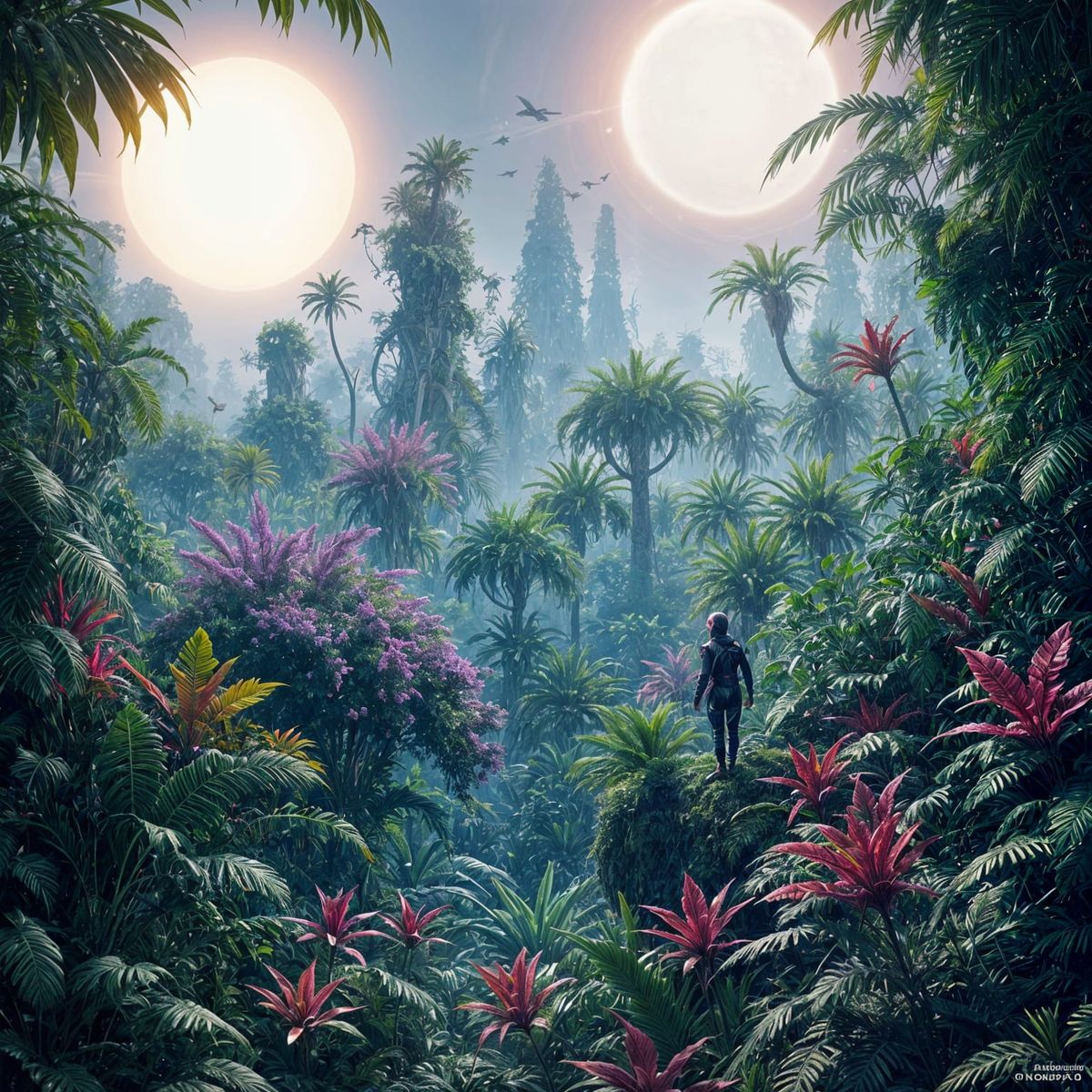 This digital painting showcases a vibrant alien jungle with strange plants and creatures under twin suns. An explorer in retro gear navigates the lush, purple-hued foliage with volumetric lighting.