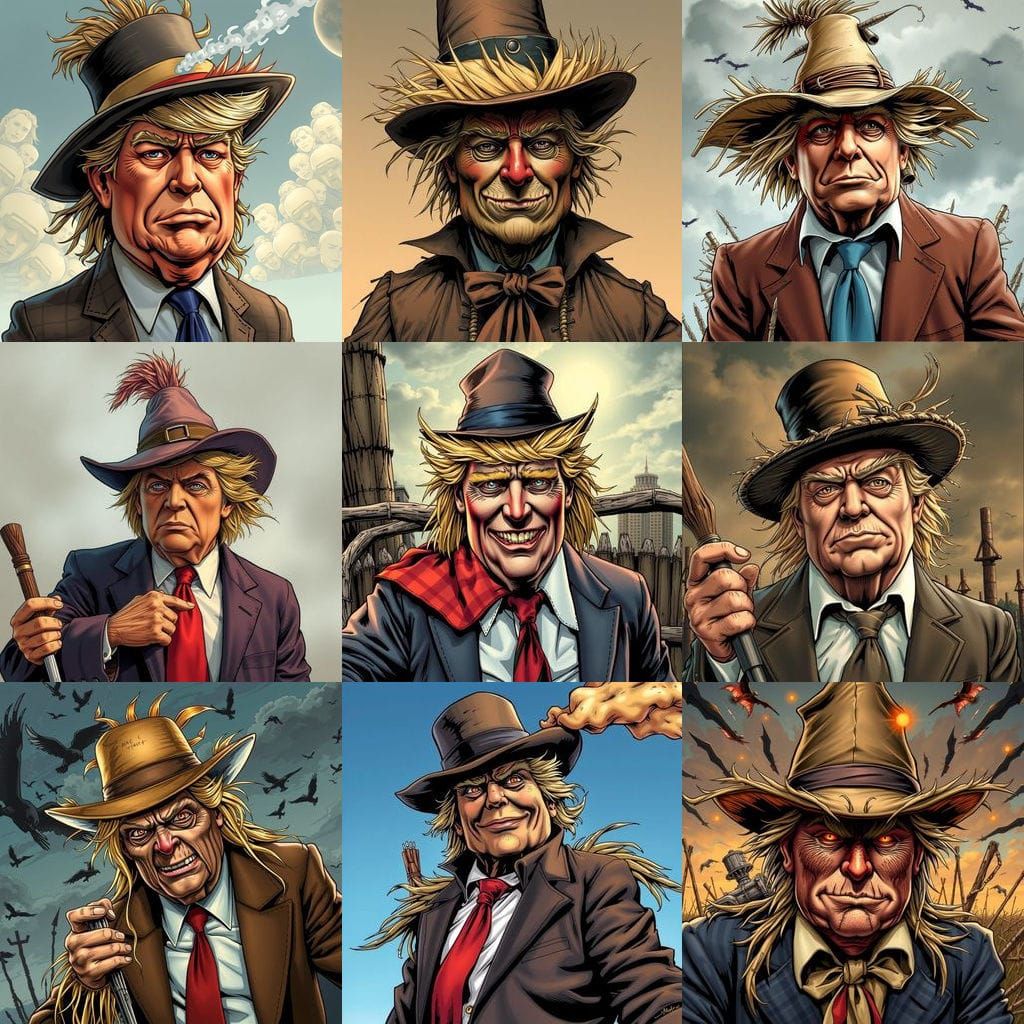 This image shows a comic book style rendering of a scarecrow resembling Donald Trump. The artwork is smooth and detailed, evoking a modern comic art aesthetic.