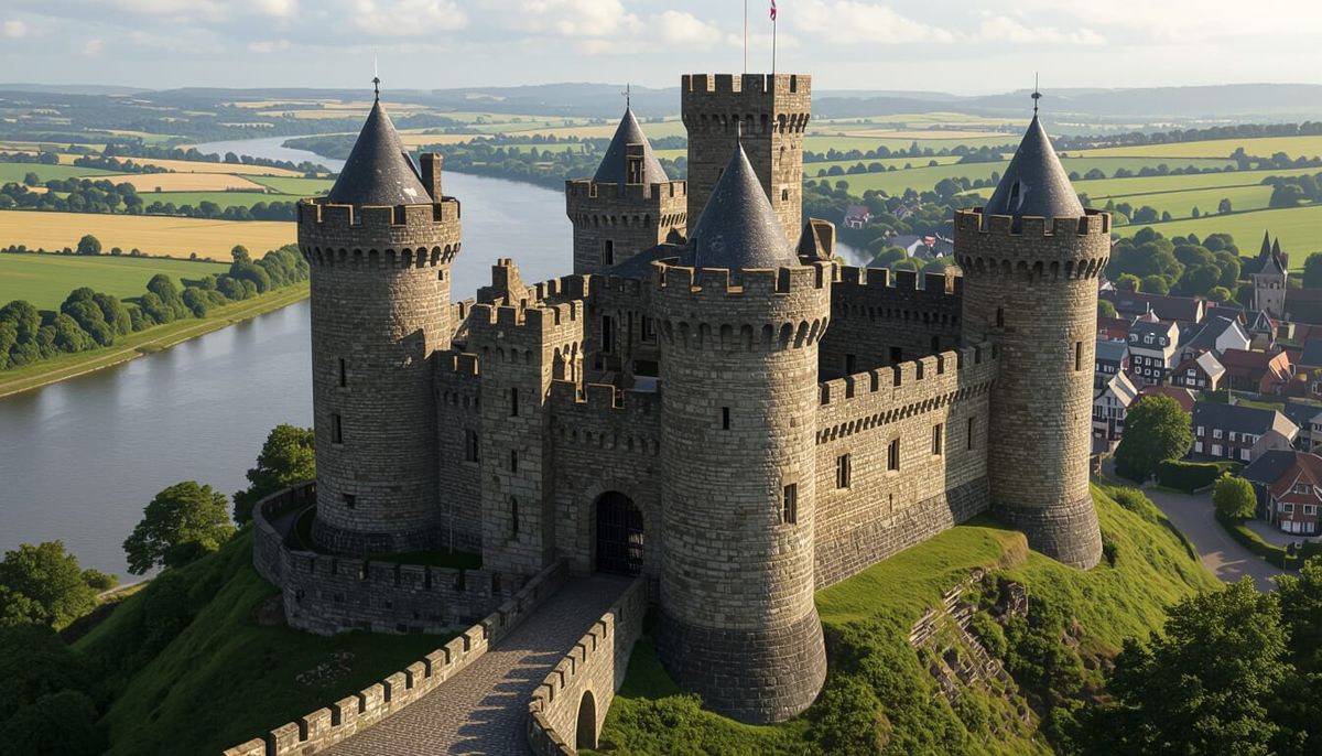 Magnificent castle with towers, crenelated walls, and a large portcullis gate, with a view of the surrounding countryside