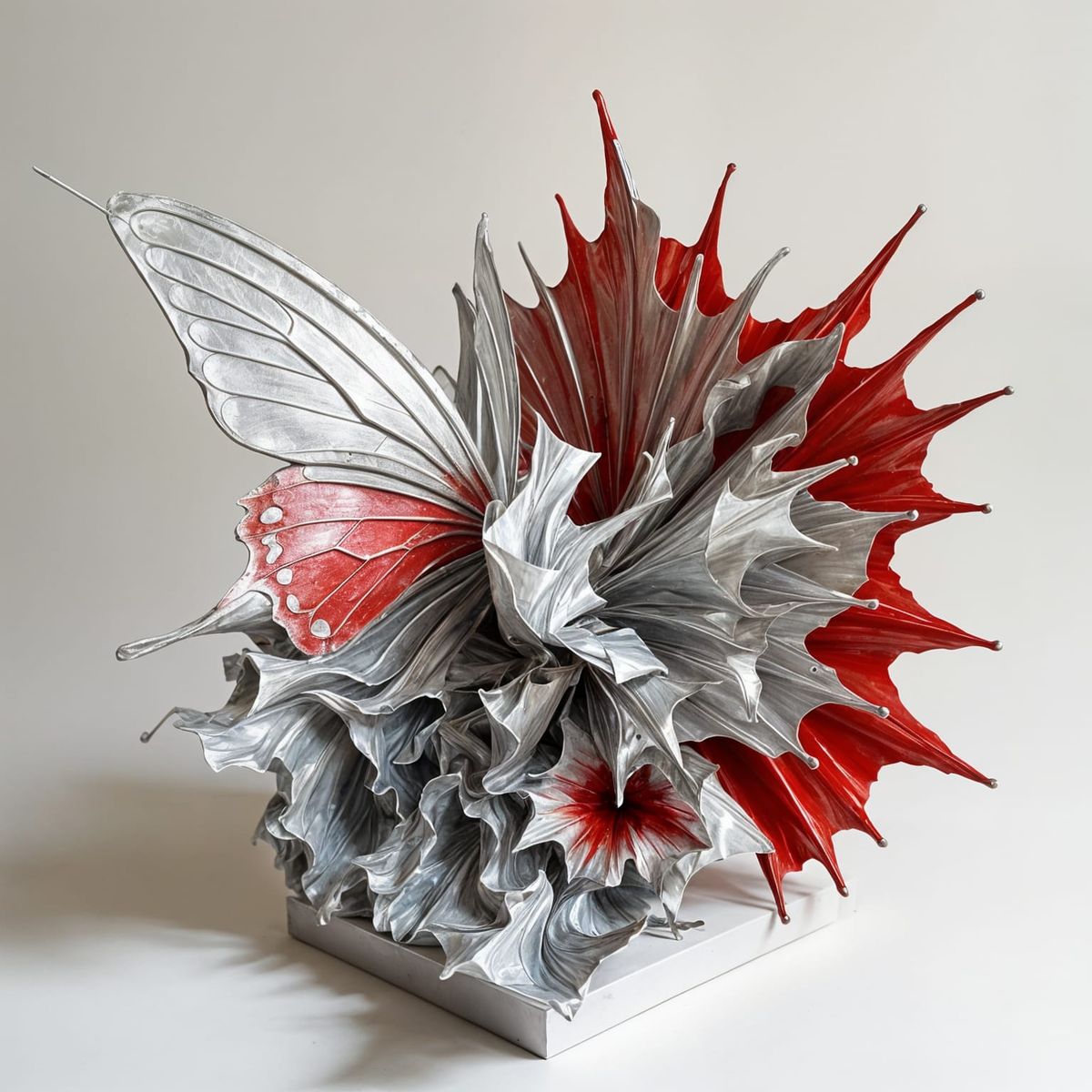 This striking sculpture, crafted from liquid silver, paper, and wings, depicts the visual impact of a loud sound with energetic paint strokes, in an abstract expressionist style.