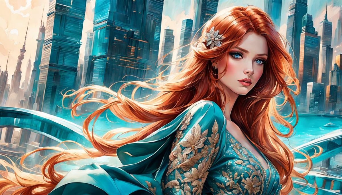 This image shows an anime-style pin-up of a woman with long red hair in front of a futuristic cityscape. This vibrant watercolor art features soft focus and romantic, sensual elements.