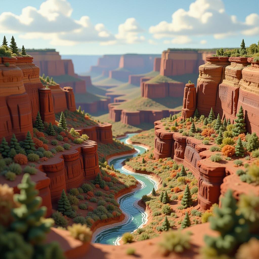 This image shows a meticulously crafted miniature Grand Canyon from clay. The landscape features layered red rock, dense forests, and rivers, presented with earthy tones and dreamlike qualities.