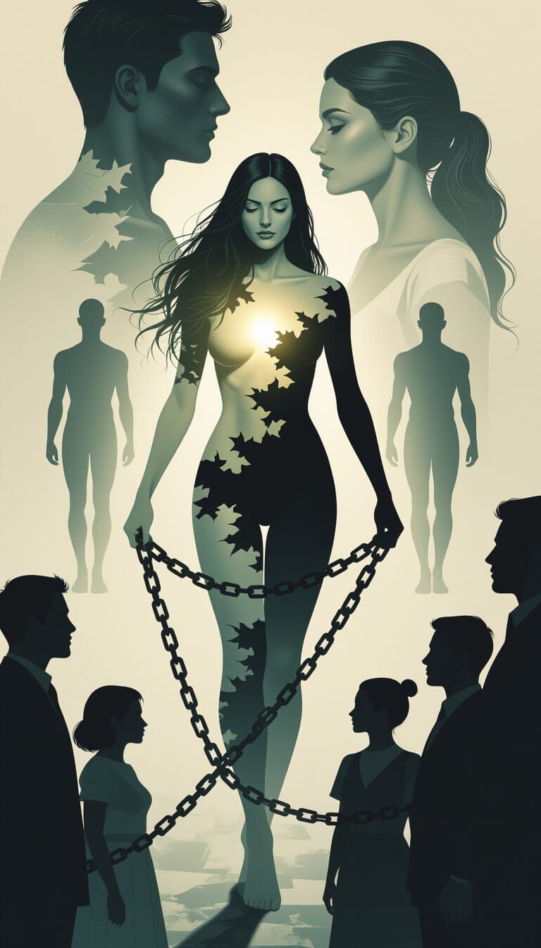 This abstract artwork symbolizes liberation from censorship, showing diverse figures illuminated as chains break. Evocative and thought-provoking with dramatic lighting.