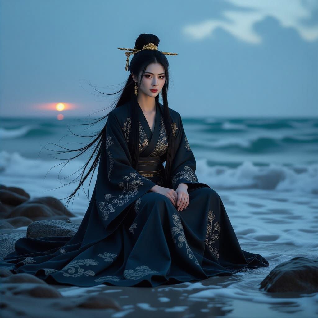 A hyperrealistic, atmospheric portrait of a Chinese sorceress with pale skin, adorned in scales and gold shells, sitting on a rock amidst turbulent waters during a storm. HDR, cinematic.
