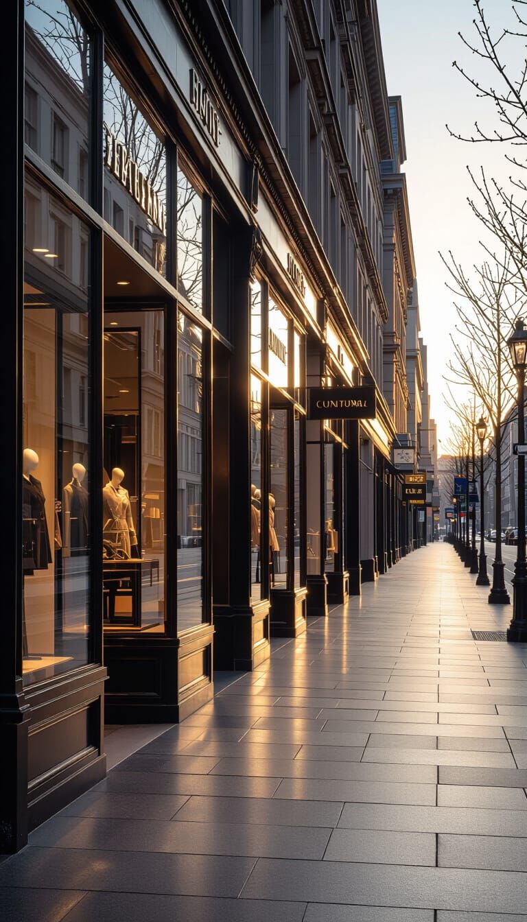 This image shows a luxurious European street at dawn with elegant shopfronts and a wide sidewalk. The scene is bathed in soft, natural daylight, rendered with hyper-realistic details.