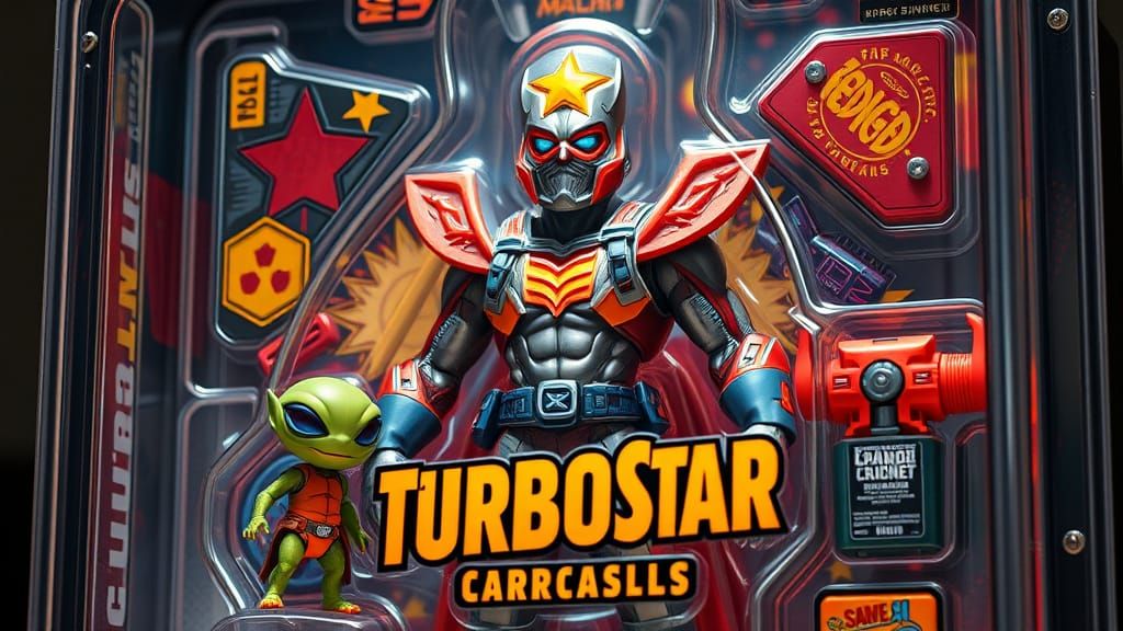 This vibrant image shows a dynamic superhero duo, TurboStar and Zorvath, posed in a comic-book inspired setup, surrounded by colorful accessories and graphics, with a focus on photorealistic, cinematic lighting and detailed textures, reminiscent of 3D videogame graphics and digital art.