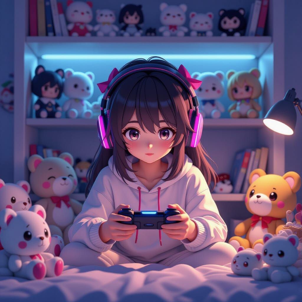 A young girl is engrossed in gaming, with plush toys and collectible figures filling her room. Rendered in a detailed 3D anime style with dynamic lighting.