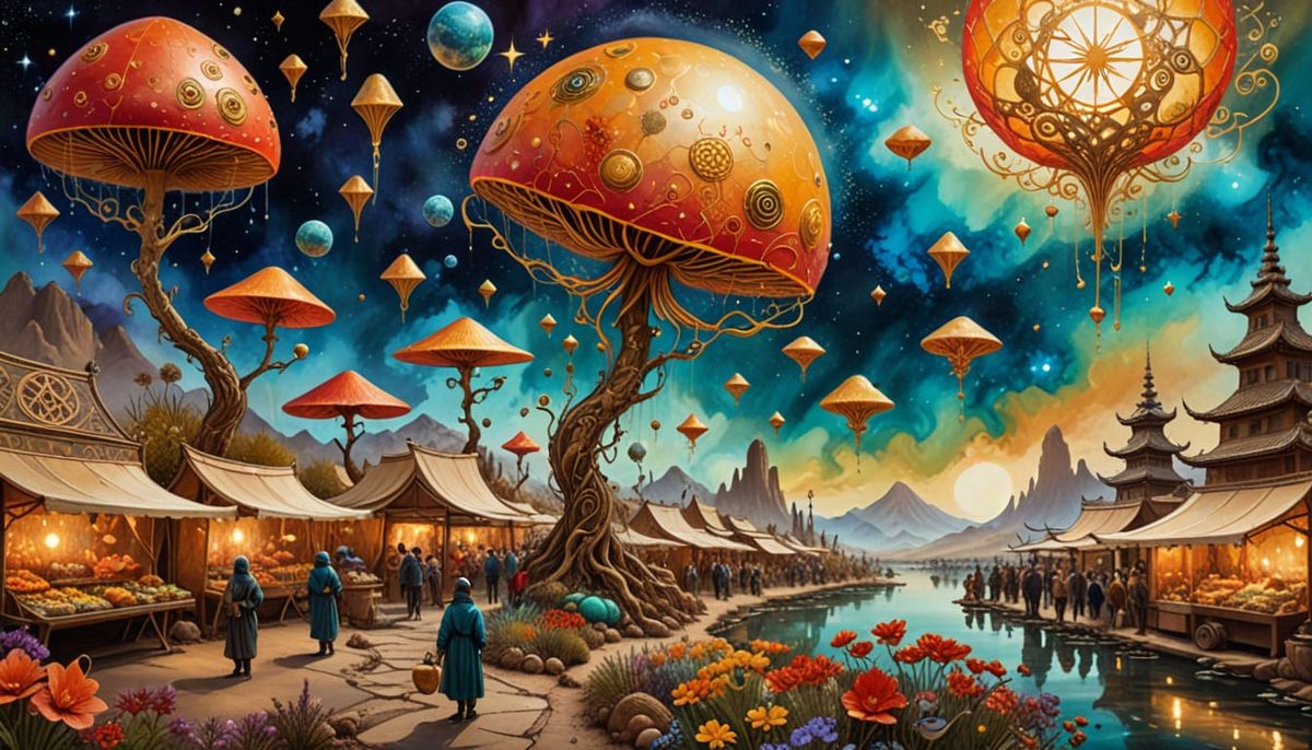 This image shows an alien marketplace with crowded stalls and exotic goods. Intergalactic shoppers sample foods and trade for treasures in a surreal, zero-gravity bazaar with dreamlike abstract flowers and sacred geometry.