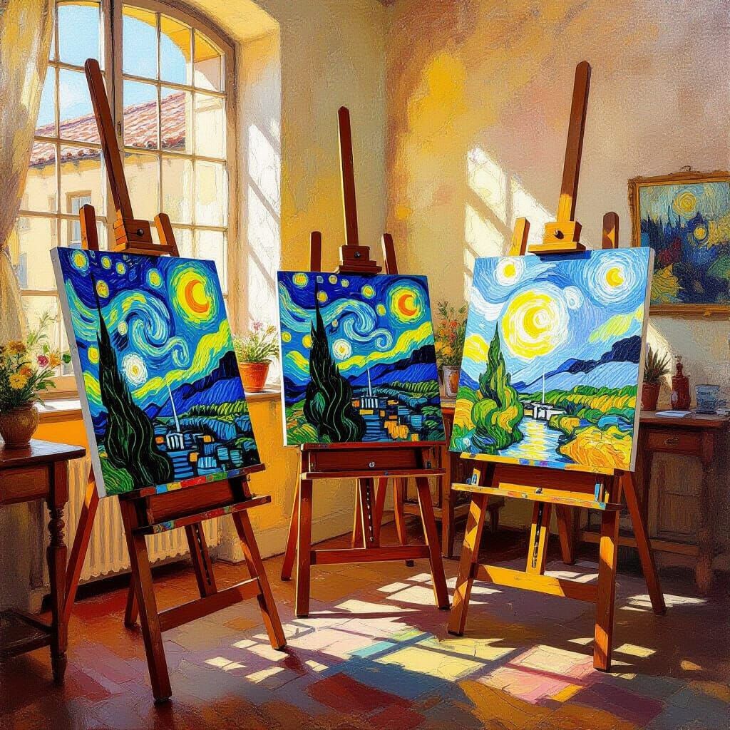 This image showcases ornate wooden easels with vibrant oil paints in a studio bathed in golden hour light. The scene is rendered with rich, textured brushwork, evoking a warm, dramatic atmosphere.