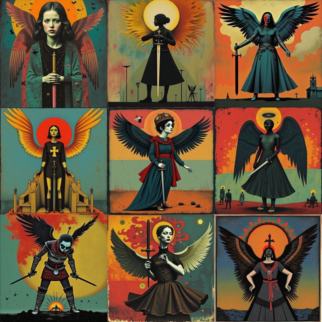 This image shows a vibrant and surreal collage of a warrior angel brandishing a sword. The artwork features a mixed media style and a bright, colorful palette.