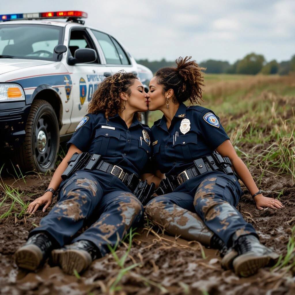This image shows two Black female police officers sharing a kiss in a muddy field. Their uniforms are soiled, shoes cast aside, beside their patrol car, rendered with romantic realism.