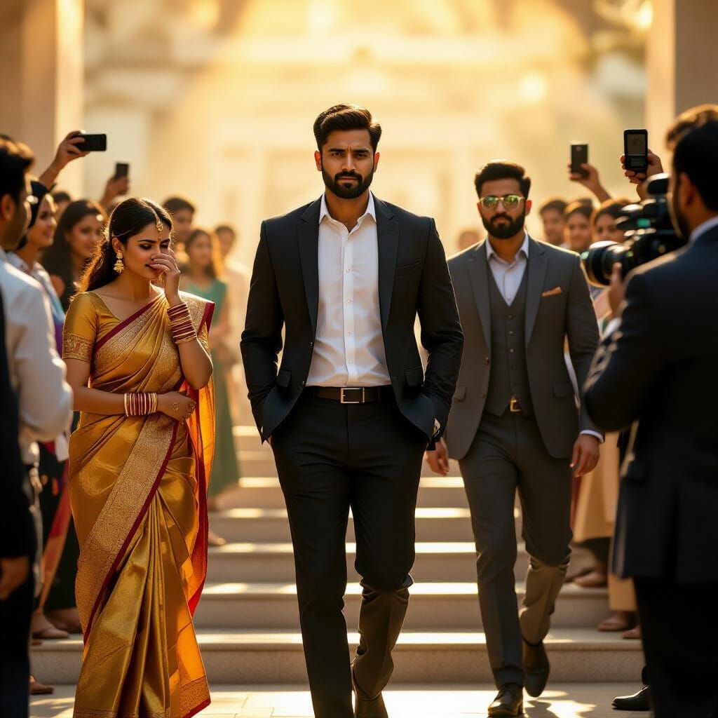 This image shows an Indian man in a blazer exiting courthouse stairs into golden sunlight, with an emotional woman and a guilty man nearby amid reporters. Realistic 3D cinematic style.